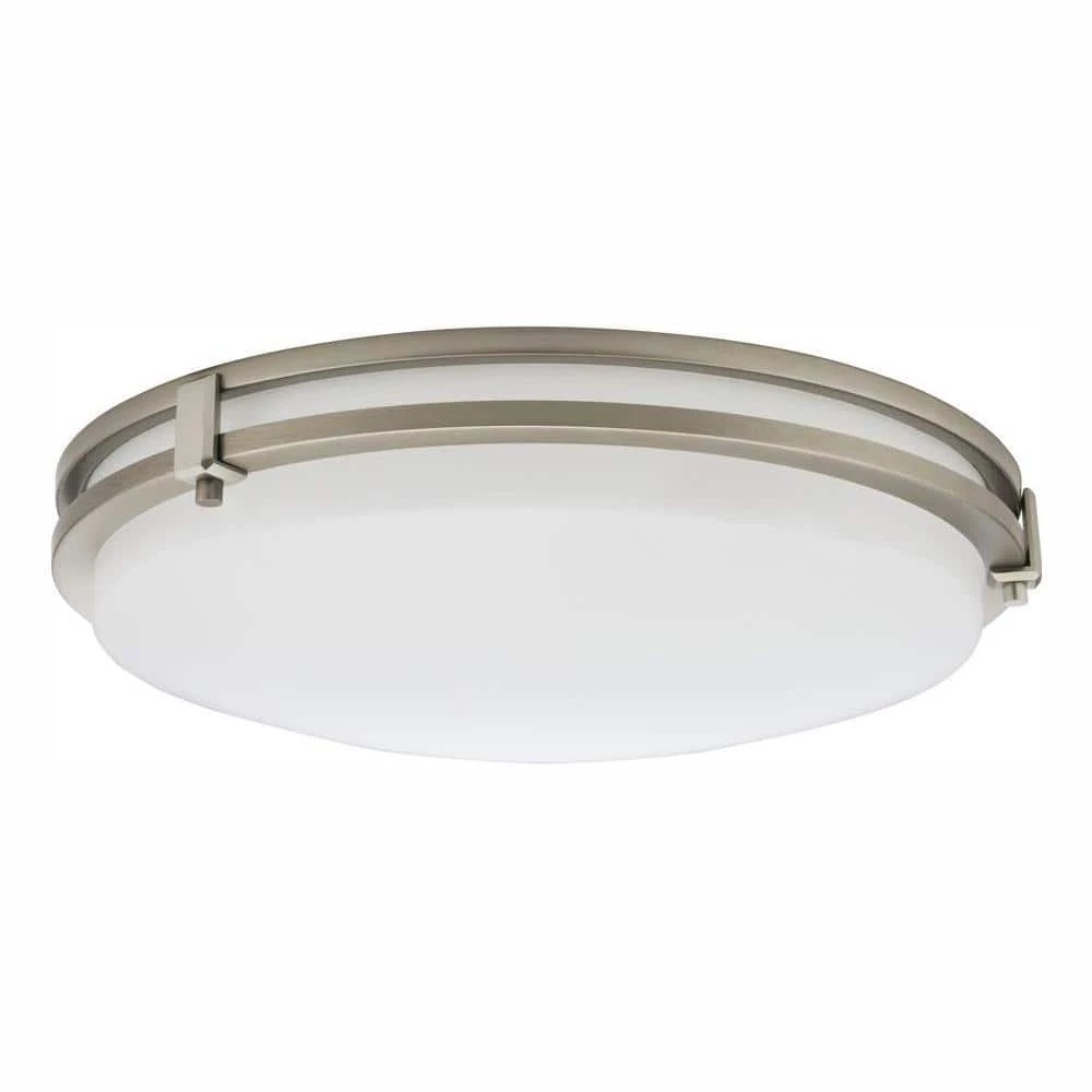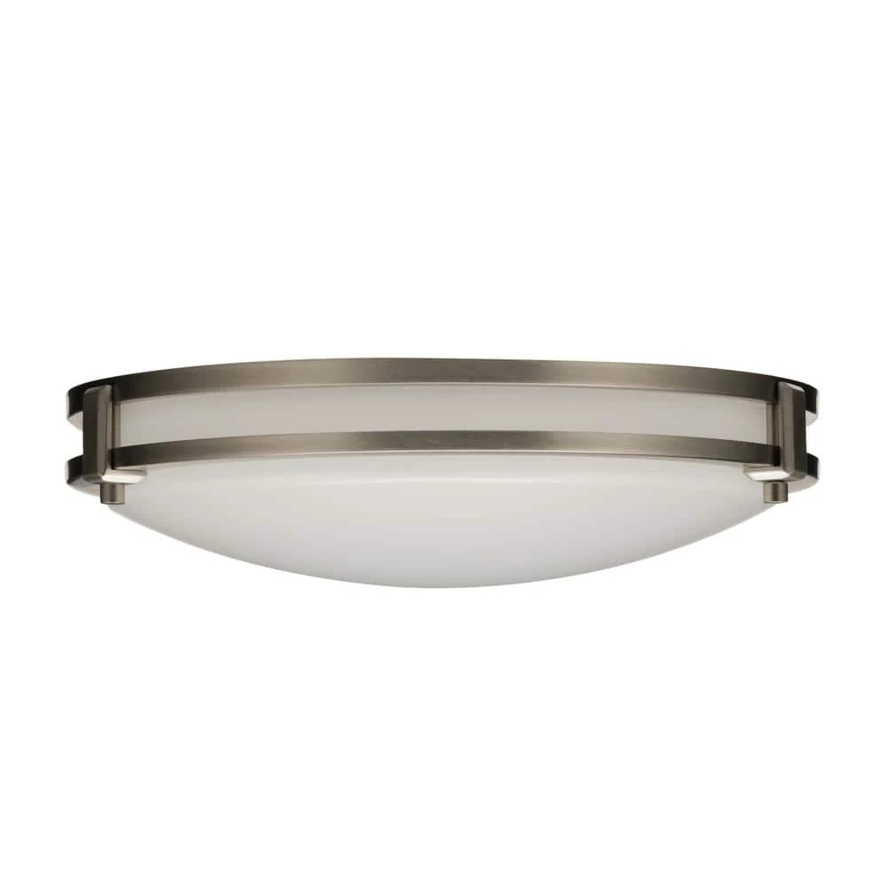 The Saturn 13 in. 16-Watt Integrated LED Flush mount from Lithonia Lighting is a contemporary style fixture with a sleek, compact design. Twin steel rings surround a dropped milk-white acrylic diffuser that provides widespread illumination and is complemented with a matching brushed nickel trim. Choosing this energy-efficient LED lighting solution over incandescent will save you money on operating costs. Best of all, the LEDs last 50,000 hours so you never have to change the bulb. This fixture is ideal for use in foyers, corridors, hallways, stairways, bedrooms, offices, utility work areas and many more commercial or residential applications.