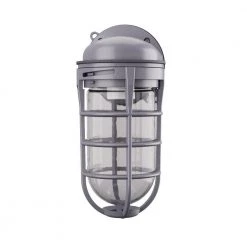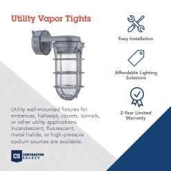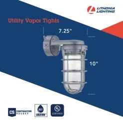 Lithonia Lighting’s Wall Mount Utility Vapor Light is ideal for entrances, hallways, closets, tunnels or other utility applications. Made of rugged die-cast aluminum housing and with a heavy-duty glass globe, this utility light has a gray finish and is designed for easy installation and maintenance. The fixture uses one 150-Watt incandescent lamp (not included).
