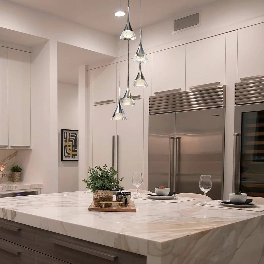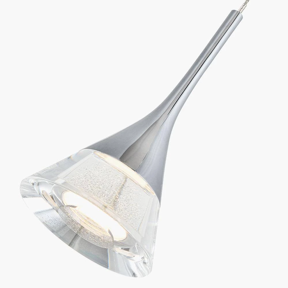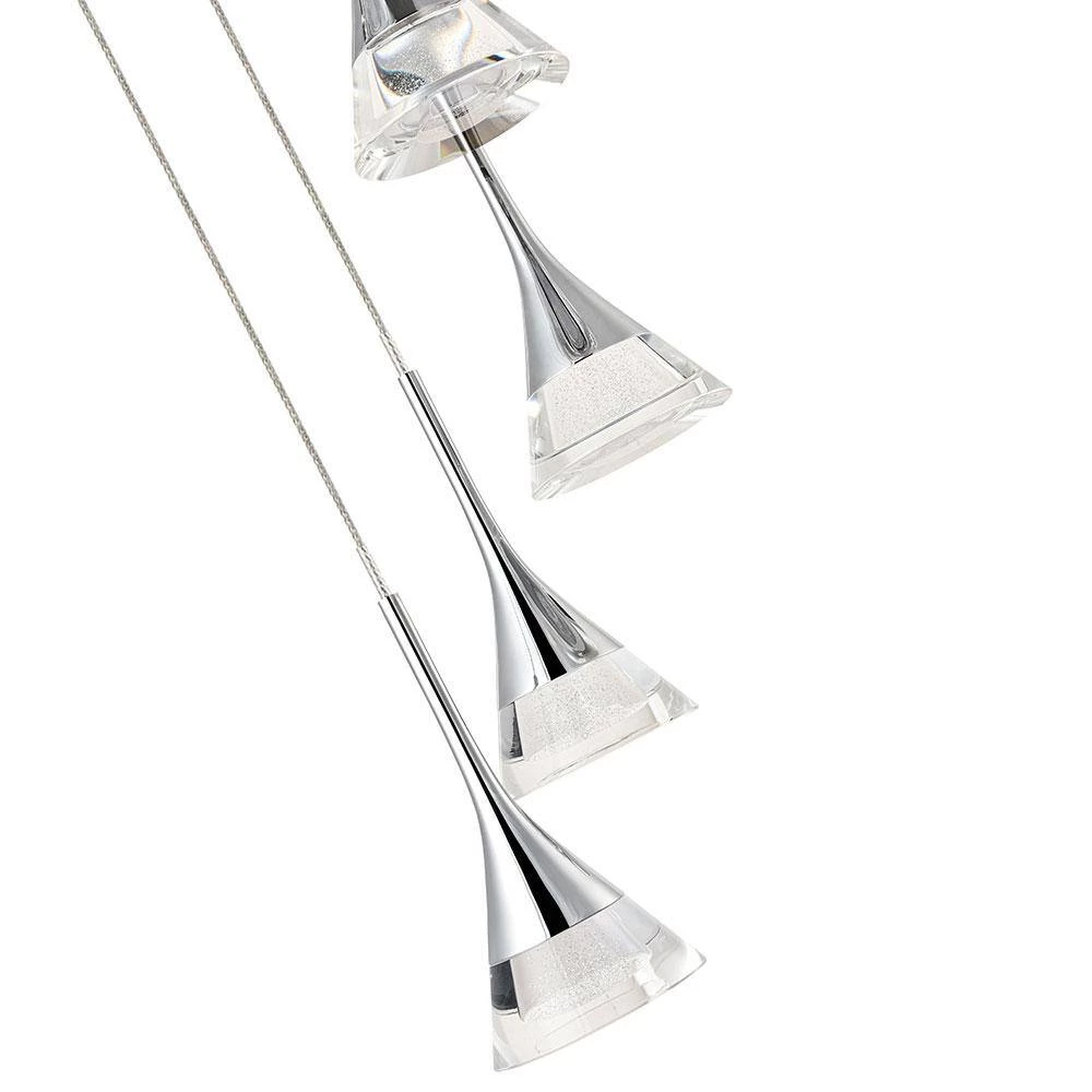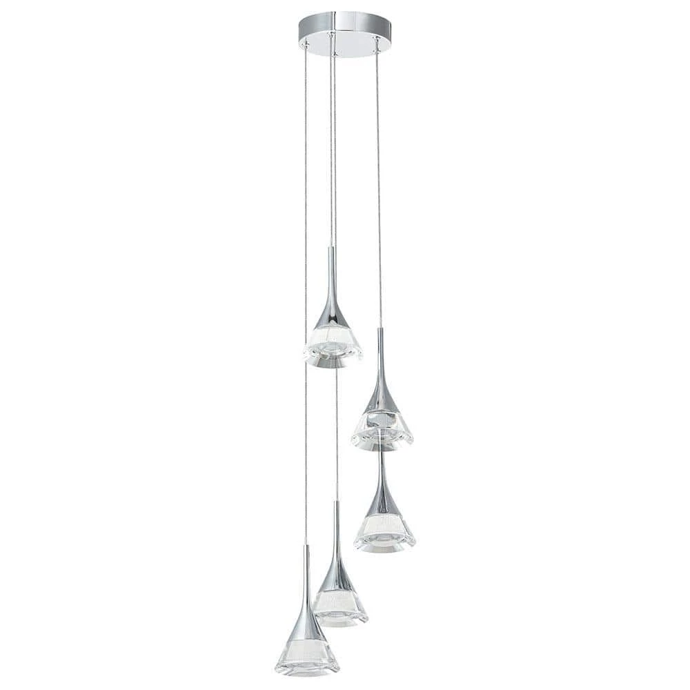 - Design: modern chandelier with 5 cone shaped acrylic shades, the shades are clear with glitter accent and polished chrome top, canopy is polished chrome
