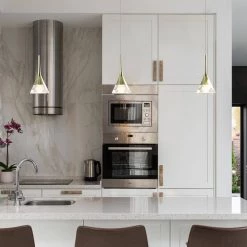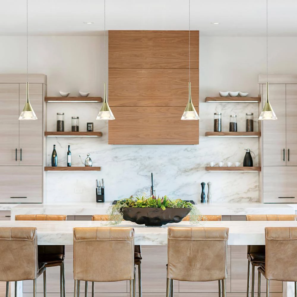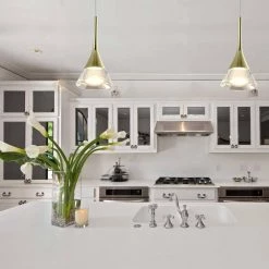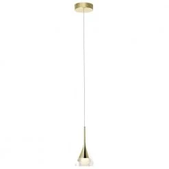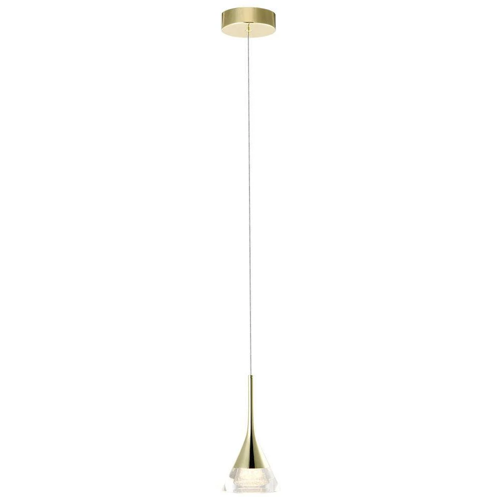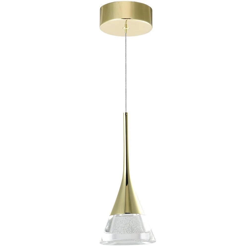- LED: integrated LED fixture, design: modern pendant with cone shaped acrylic shade, the shade is clear with glitter accent and gold top, canopy is gold