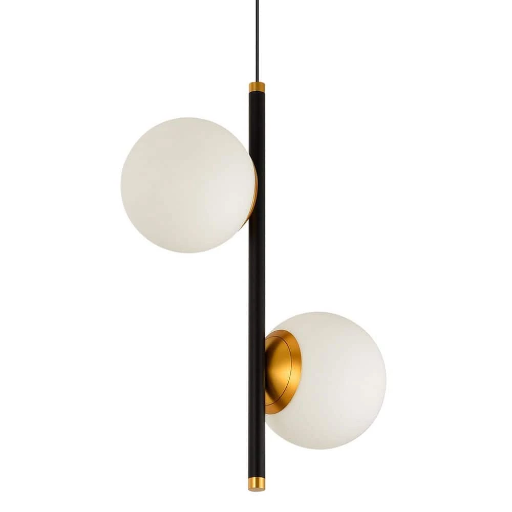 - Design: integrated LED pendant in black Finish with 2 White glass shade and gold elements for transitional elegant look