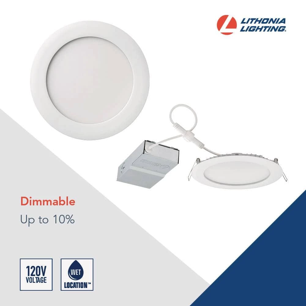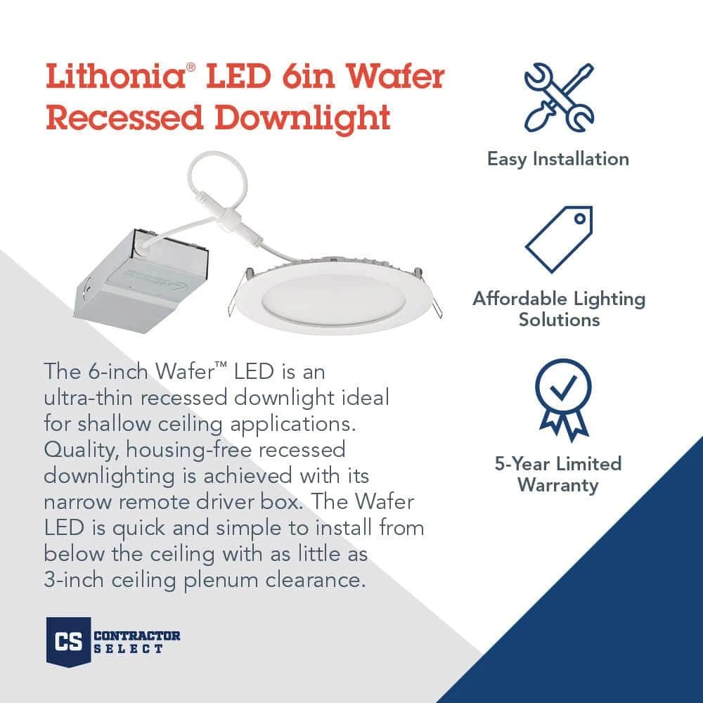 The Wafer-Thin LED recessed downlight with remote driver box combines high quality light output and efficiency while eliminating the need for a recessed housing. The innovative, slim design allows for easy retrofit, remodel or new construction installation from below the ceiling. The Wafer downlight provides general illumination in residential and commercial applications including multi-family and hospitality. Ideal for use in living and dining areas, bedrooms, closets, hallways, bathrooms, kitchens, basements, soffits, entryways and porches. The Wafer LED downlight is wet location listed – making it ideal for use in a breadth of outdoor residential, hospitality, commercial and multi-family applications.
