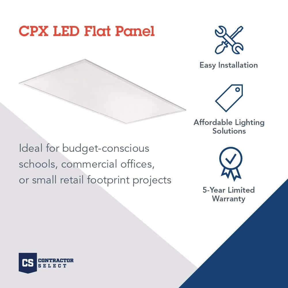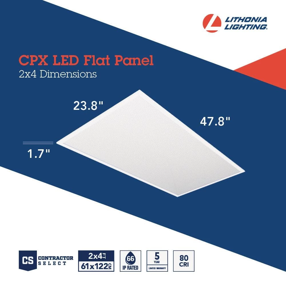 The 2 ft. x 4 ft. CPX panel from Lithonia Lighting is the perfect choice for a quality LED panel at an affordable price. The cost effective and reliable luminaire features an A12 lens. This CPX configuration offers Adjustable Light Output (ALO) for the option of 3800 Lumens to 6500 Lumens and Switchable White (SWW) for 3-color temperatures in 1 – 35/40/50K CCT. CPX is the perfect choice for budget-conscious schools, commercial offices or small retail footprint projects.