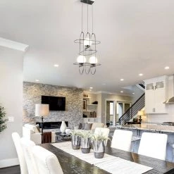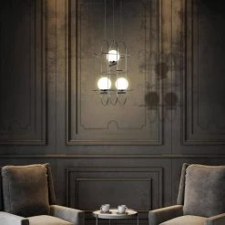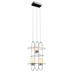 - Design: modern chandelier with aluminum wire frame and white frosted glass ball shaped shades light direction ambient