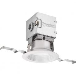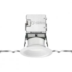 The OneUp recessed direct-wire LED downlight includes integrated junction box, trim, pre-installed non-metallic bushings and 3-port push wire quick connectors in 1 package. The OneUp is the most economical means to create a well lit environment with exceptional energy efficiency and near zero maintenance. Round baffle recesses optical system into the ceiling to prevent glare and provide a traditional look. Diffused lens provides even light distribution for general illumination, equivalent to 50W incandescent flood lamp.