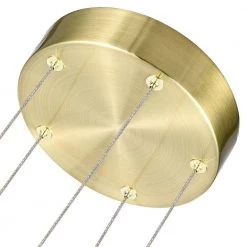 - Design: modern chandelier with 5 ball shaped acrylic shades, the shades have brass top and white bottom with crystal sand inside, canopy is brass
