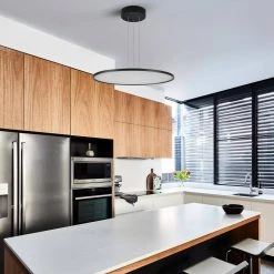 I love the modern design of this chandelier. The 24-inch LED disk provides excellent lighting for my kitchen island. The black finish is sleek and matches my kitchen theme. The height adjustment feature is a bonus. Very satisfied with my purchase!