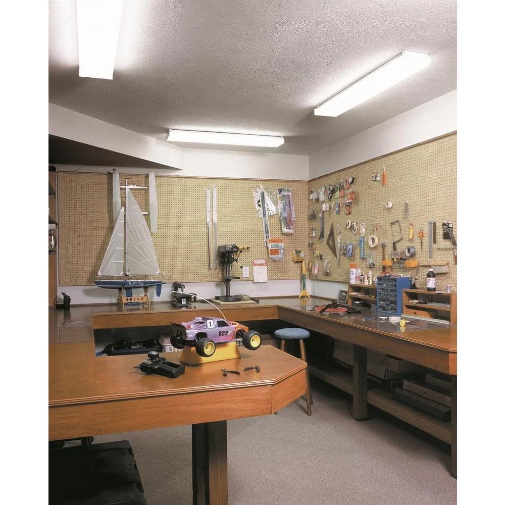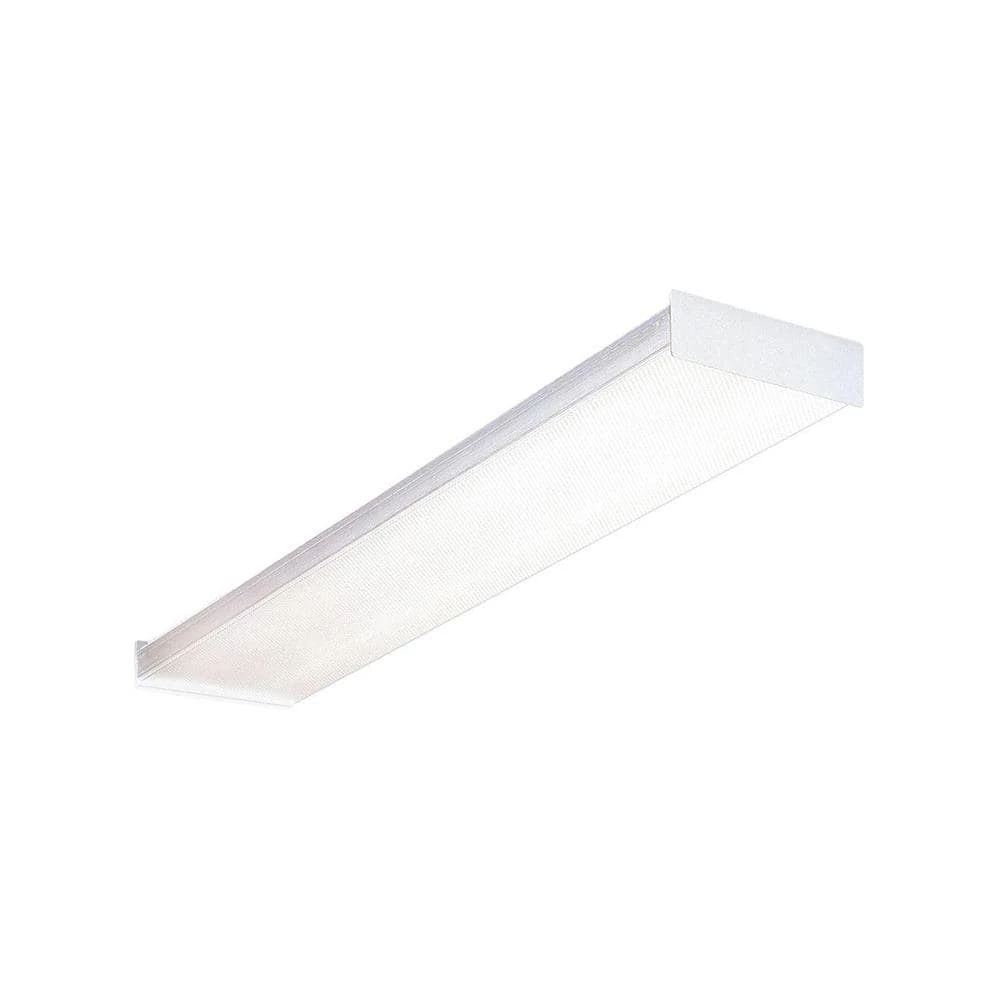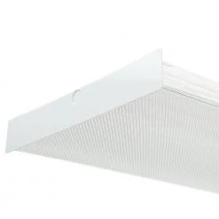 The Lithonia Lighting 4 ft. Wraparound Lens Ceiling Fixture has a 4-bulb, square-basket design and has a clear prismatic diffuser and white metal ends. This fixture has an instant-on ballast design to help prevent flickering and humming and is great for areas requiring high light levels. This fixture is ideal for use in workshops, utility rooms and garages.