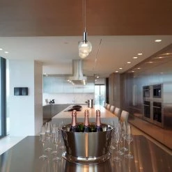 - Design: modern pendant with ball shaped glass shade, the glass shade is clear with glitter accent and polished chrome top, canopy is polished chrome