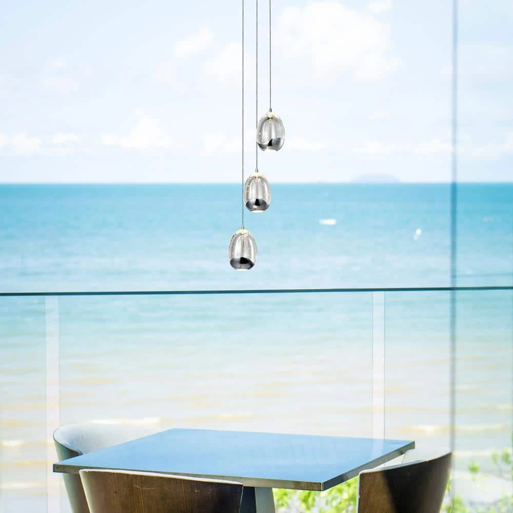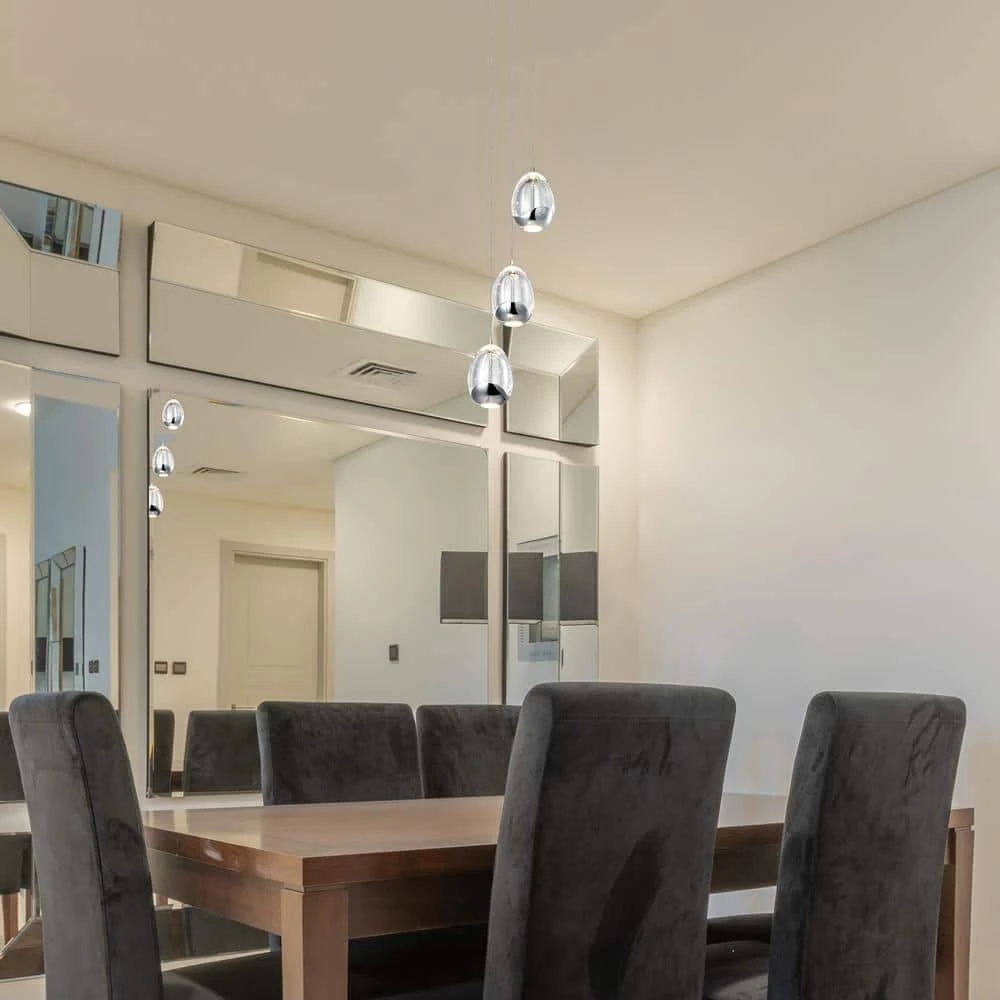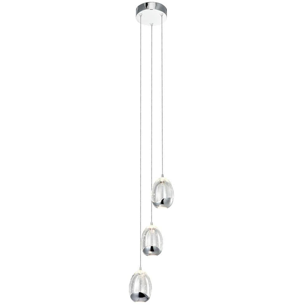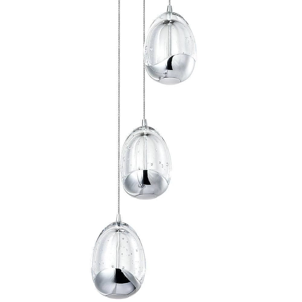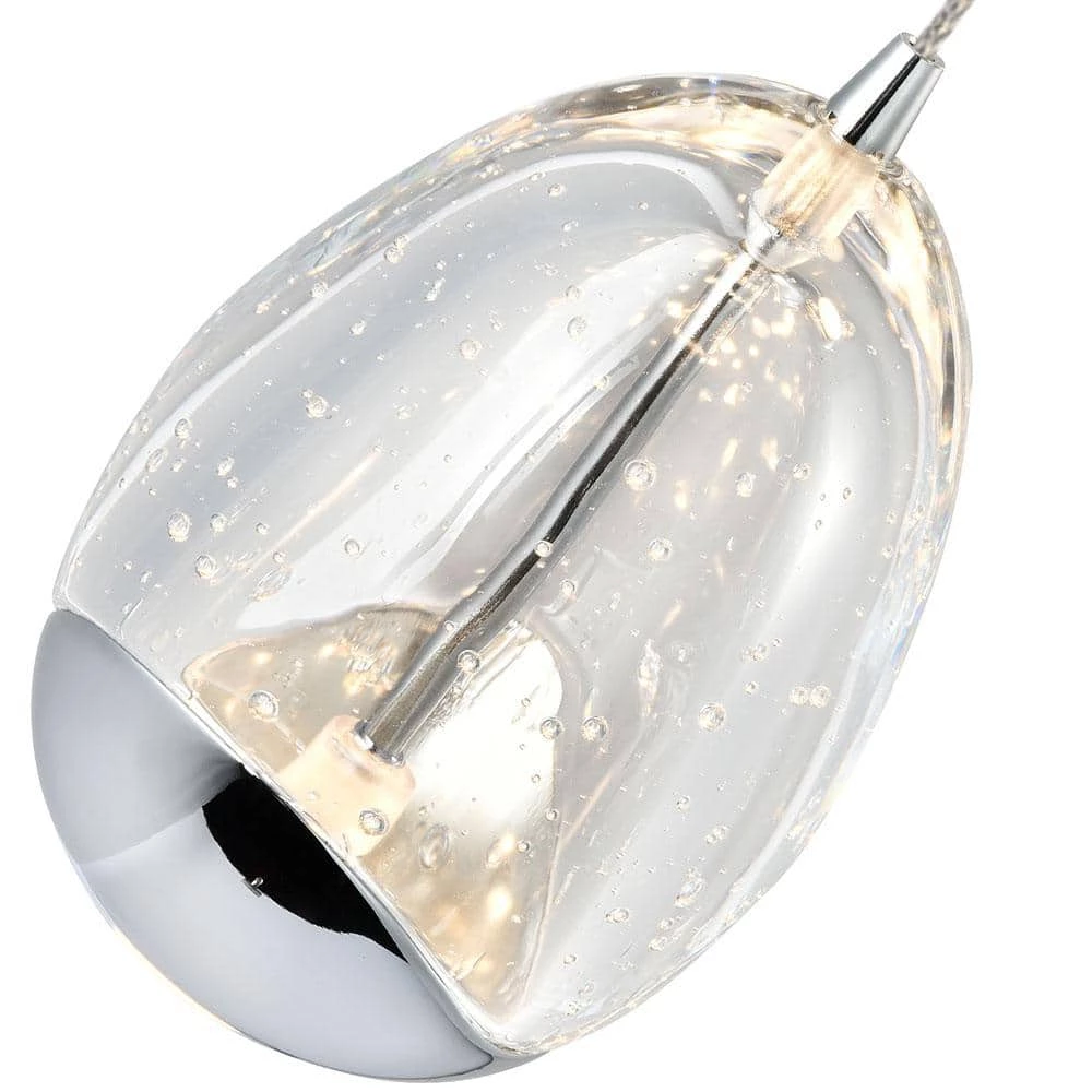 - LED: integrated LED fixture, design: modern pendant with 3 oval shaped glass shades, the glass shades are clear with bubbles accent and polished chrome bottom, canopy is polished chrome