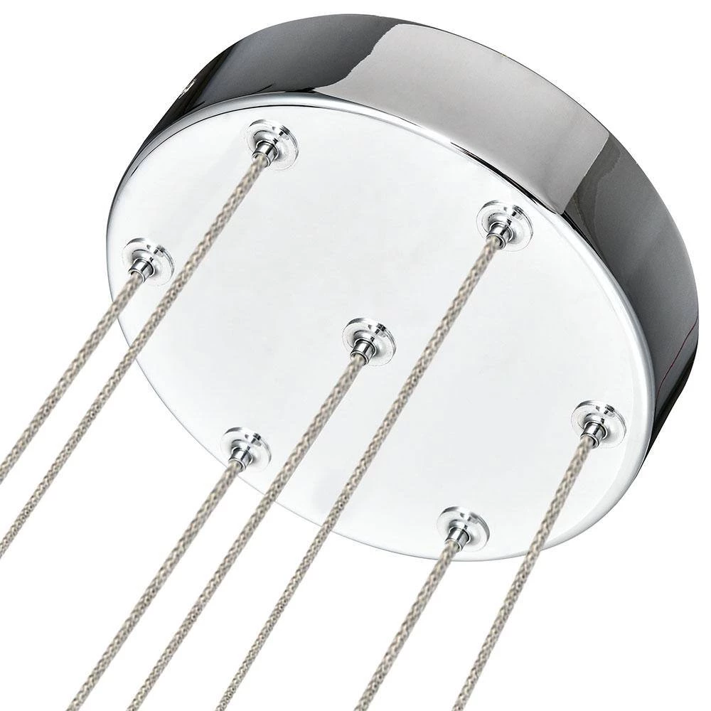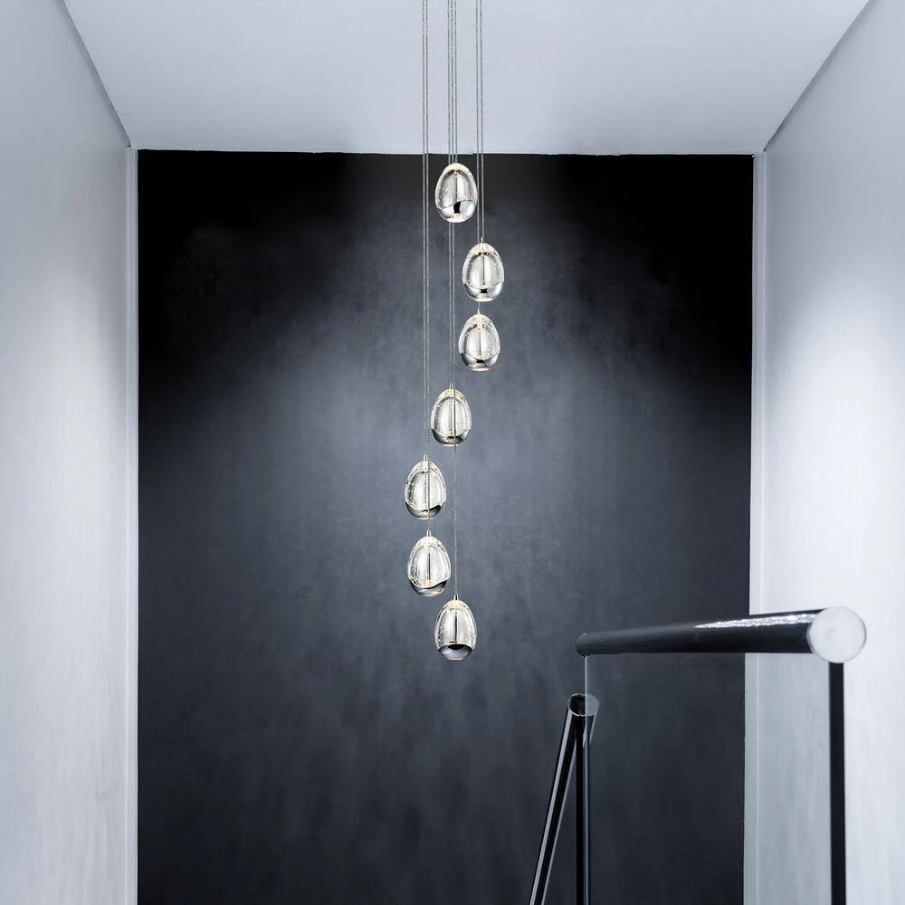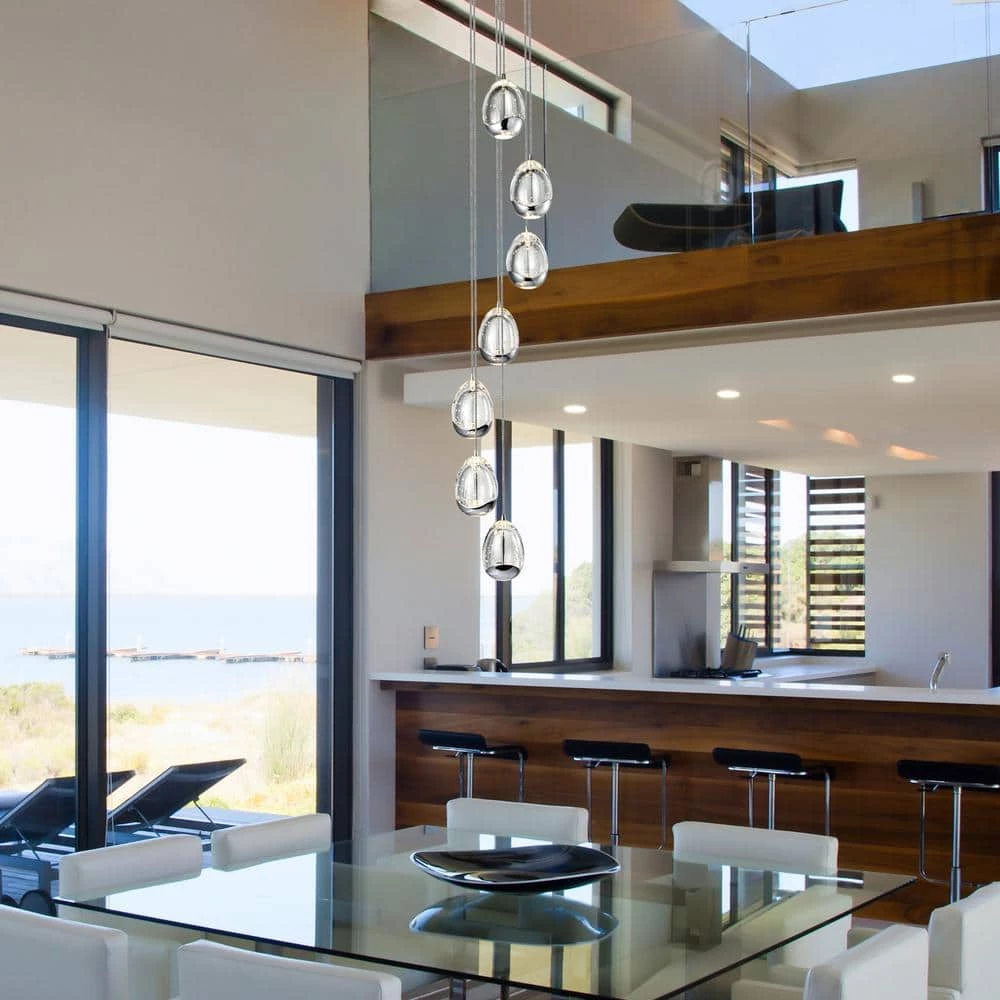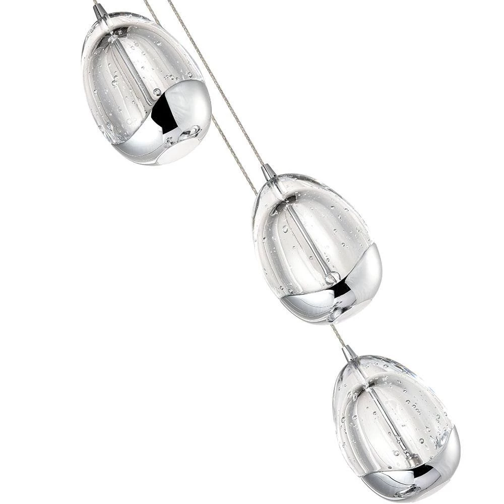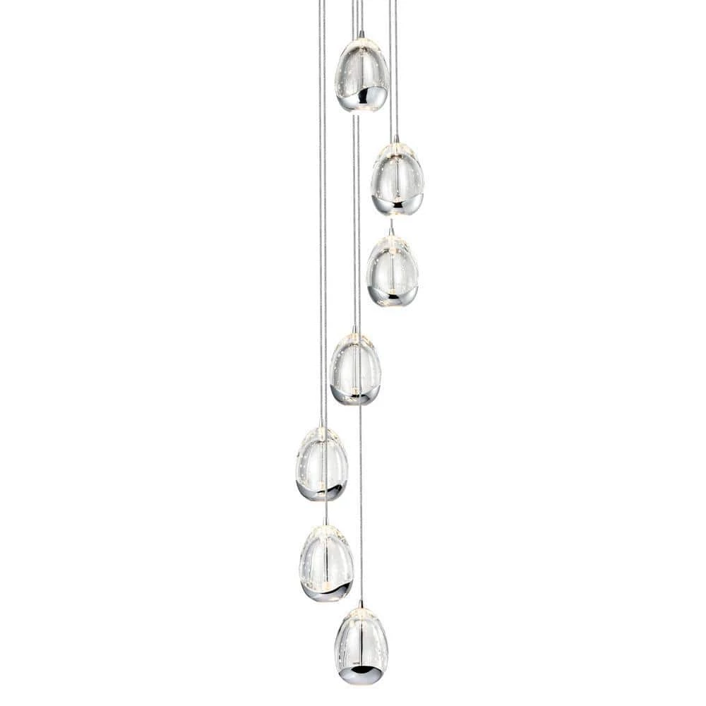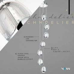 - Design: modern chandelier with 7 oval shaped glass shades, the glass shades are clear with bubbles accent and polished chrome bottom, canopy is polished chrome